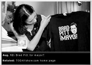 現(xiàn)在,市長競選的宣傳工作已經(jīng)啟動(dòng),除了競選徽章出爐,還有許多市民從7月份開始身穿印有“Brad Pitt for Mayor(選布拉德·皮特當(dāng)市長)”字樣的T恤。該T恤在當(dāng)?shù)刭u到20美元一件。