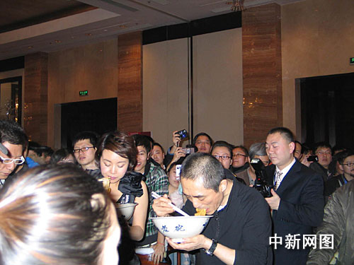 在《三槍》中,“高桌子低板凳都是木頭”的陜西話地道風(fēng)趣,熱氣騰騰的油潑面更讓中國各地觀眾頓生興趣。很多觀眾看完 《三槍》,第一感覺就是想來一碗熱辣辣的油潑面。影片結(jié)尾,所有人復(fù)活,一起狂吃油潑面,場面壯觀。而今天,張藝謀、孫紅雷、閆妮、小沈陽、倪大紅等主創(chuàng)也當(dāng)眾“秀”了一把陜西油潑面。如《三槍》中的歌詞所唱:“吃碗油潑面,我保準(zhǔn)就能啪啪地沖鋒向前”。