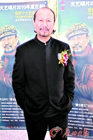 昨天,帶著暌違兩年多的新專輯《云中的月亮》來到現(xiàn)場的“蒙古歌王”騰格爾最受媒體關(guān)注。和以往的風(fēng)格不同的是,新專輯海報和唱片封面上的騰格爾身穿皮衣,頭戴一頂鴨舌帽格外扎眼。在接受采訪時,騰格爾笑著說這張專輯除重新編配了一些老歌,主要是他近兩年來的新作,少了些蒙古味,多了點時尚感,而封面新造型也同樣是一次大膽嘗試。“整張專輯有6首詞和8首曲都是我自己寫的,和以往相比,這張新作比較大眾化。”