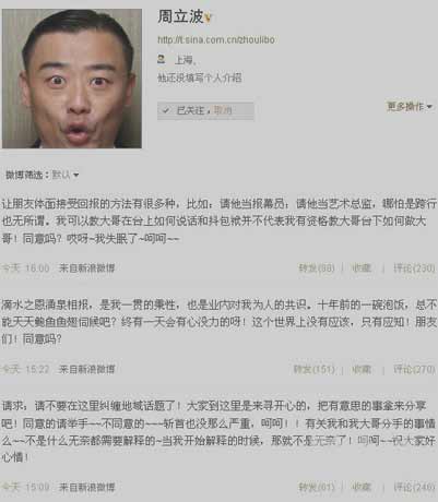 采訪首先圍繞關(guān)周分手。周立波說:“我很無辜,老關(guān)也很無辜,有人在中間挑事,我們會查的。”他告訴記者,知道媒體“踢爆”兩人分手一事時,他正在與前紐約警察局華人局長莫虎一起喝酒,而當(dāng)天下午他剛在無畏號航母上看了“珍珠港事件”的紀(jì)錄片,當(dāng)時他的第一個反應(yīng)是“沒想到我也遇上珍珠港事件了”。由于當(dāng)時認(rèn)為是關(guān)棟天向媒體“踢爆”此事,而且當(dāng)晚酒喝得比較多,因而在微博上寫下了幾段很有爭議的博文,包括“泡飯鮑魚”說!敖Y(jié)果阿春(孫徐春)用人格向我擔(dān)保決不是‘老怪頭’(周立波和孫徐春對關(guān)棟天的昵稱)說出去的,我相信他!敝芰⒉ū硎荆舜畏质种皇撬囆g(shù)和商業(yè)上的分手,兩人的藝術(shù)觀點(diǎn)不同。