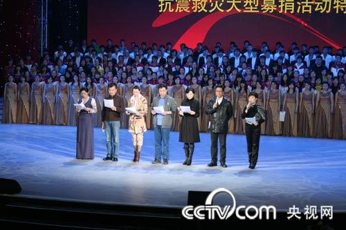 央視知名主持人周濤、朱軍、董卿、張澤群將作主持、采訪人;白巖松、李瑞英作新聞連線人;李詠、畢福劍、馬東、朱迅、任魯豫、崔永元、王小丫、撒貝寧、鞠萍、韓喬生、董浩、歐陽夏丹、李梓萌、胡蝶、魯健等50人擔(dān)任現(xiàn)場(chǎng)捐助熱線電話接線員。