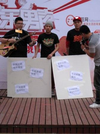 今年快男注定與眾不同,不僅“偽娘”選手備受關(guān)注,而且連“反偽娘”選手也不失風(fēng)采,上周快男土豆網(wǎng)分賽區(qū)一組特殊選手C-BLOCK組合因在比賽現(xiàn)場(chǎng)打出 “保護(hù)純爺們 消滅偽娘族”的參賽口號(hào),而備受網(wǎng)友關(guān)注并被封為“反偽娘斗士”,而有關(guān)這場(chǎng)“偽娘”與“反偽娘”的對(duì)決,昨日舞美師在博客爆出猛料:“著姐入圍前三甲不是問(wèn)題,首先是因?yàn)槲矍虻男枰,這也是湖南衛(wèi)視選秀常用手段;不僅如此,劉著也已經(jīng)秘密簽約湖南衛(wèi)視旗下長(zhǎng)沙天娛公司”。而針對(duì)舞美師的爆料內(nèi)容,記者也從網(wǎng)上了解到該組合相關(guān)資料,首先該C-BLOCK組合來(lái)自長(zhǎng)沙,在當(dāng)?shù)匾恢毙∮忻麣,?shí)力不俗,去年多次參加湖南衛(wèi)視王牌節(jié)目《快樂(lè)大本營(yíng)》、《成年禮》、《8090》等節(jié)目,而關(guān)于“偽娘”劉著網(wǎng)上開(kāi)始有人爆出其與湖南衛(wèi)視關(guān)系甚密,這些相關(guān)信息與舞美師爆料內(nèi)容十分契合。為進(jìn)一步求證舞美師的爆料內(nèi)容,記者向湖南衛(wèi)視快男導(dǎo)演組一編導(dǎo)求證,他表示:“不要相信舞美師博客內(nèi)容,純屬造謠,快男比賽保證公平選拔”! 漪