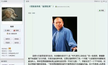 記者根據(jù)網(wǎng)友所曝光的內(nèi)容了解到,此次韓寒發(fā)文的動(dòng)機(jī)是源于近日的一次采訪,某周刊雜志記者問韓寒“大家都說你是最敢說真話的人,那你覺得郭德綱和周立波誰比較優(yōu)秀?不許打太極!”韓寒當(dāng)時(shí)回答道:“我覺得郭德綱在曲藝方面更具有文化底蘊(yùn)和內(nèi)涵,在才藝表演上也更具文化優(yōu)勢,但是從娛樂人民的實(shí)用角度上看,周立波和郭德綱難分伯仲!倍潞箜n寒擔(dān)心這個(gè)采訪會(huì)給記者產(chǎn)生斷章取義的“誤解”,造成“挺郭貶周”的爭議,于是當(dāng)晚趕在這篇采訪見稿前,先發(fā)制人地在自己的博客撰文《請別誤傳我“挺郭貶周”》,詳細(xì)澄清對郭德綱和周立波的個(gè)人見解。