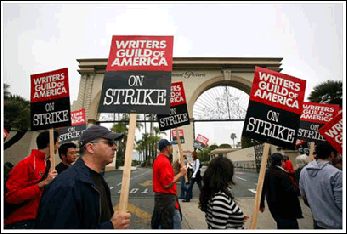 最近,洛杉磯真是不太平。不久前,山林大火燒了一個(gè)多星期,至少造成15億美元的損失。本月5日,好萊塢劇作家們又在工會(huì)的領(lǐng)導(dǎo)下,開始在全美國罷工。這是20年來的第一次劇作家罷工,在美國各界引起相當(dāng)大的反響。這些平日深鎖家中爬格子,難得露面的好萊塢劇作家們,一大早聚集在八大影業(yè)公司以及迪斯尼總部的攝影棚外,他們高舉標(biāo)語牌,聲稱這次對“電影暨電視制作人聯(lián)盟”展開的罷工,將會(huì)是一場持久而代價(jià)昂貴的行動(dòng)。電視屏幕上馬上就有了反映,一些電視臺(tái)開始播放老舊的內(nèi)容。當(dāng)然,作為同行,演員、主持人、脫口秀主持都非常支持編劇們,到現(xiàn)場慰問,并且在自己的節(jié)目中聲援罷工。