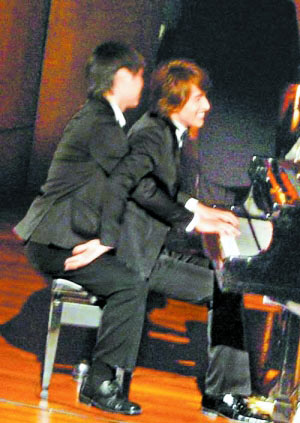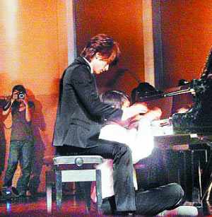 周董彈琴說(shuō)愛的《不能說(shuō)的秘密》大紅,言承旭在新戲《星心的淚光》也化身“琴圣”,可惜他琴藝不佳,須由替身“胯下”代彈,兩人十分尷尬,頻頻笑場(chǎng),變成“男體交纏”的詭異畫面,引起臺(tái)下從外地趕來(lái)捧場(chǎng)的師奶粉絲兼臨時(shí)演員陣陣驚呼,他拍完后也直呼有趣,“我本來(lái)就沒鋼琴基礎(chǔ),為拍演唱會(huì)表演已苦練了劇情需要的幾首曲子,但當(dāng)天拍攝的曲目太難,因此讓替‘手’上場(chǎng)。”