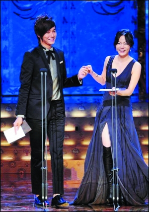 當(dāng)天,獲獎(jiǎng)的韓劇只有獲得“最優(yōu)秀青少年電視劇獎(jiǎng)”的《jungle_fish》與獲得“優(yōu)秀短篇獎(jiǎng)”的《黃金新娘》,雖然有韓星柳真和崔秀鐘擔(dān)任司儀,東方神起任表演嘉賓,還有獲得“最受歡迎男、女演員”的李準(zhǔn)基和南相美出席,但是中國(guó)明星的魅力絕對(duì)難以抵擋。蔡琳當(dāng)天以低V長(zhǎng)裙配高筒靴的造型出現(xiàn),和小綜一起頒發(fā)“最佳男、女演員獎(jiǎng)”,小綜對(duì)蔡琳贊不絕口,還頻頻表示自己被電暈了,哄得蔡琳十分開(kāi)心。而且小綜還不時(shí)用半咸淡韓語(yǔ)和臺(tái)下粉絲打招呼,引得粉絲們陣陣歡呼,大喊偶像的名字。
