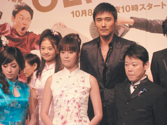 胡兵(右二)近日積極在日發(fā)展,與觀月亞里沙(右三)拍攝新片。