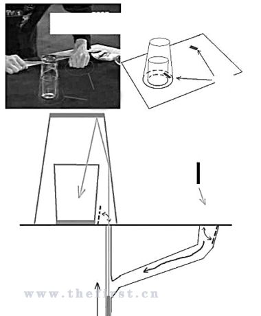 網(wǎng)友分析:在這個魔術(shù)中,我們可以注意到,大杯與小杯中間仍有縫隙,大杯是倒著放的,小杯則是正立著套在大杯里的。黑色的桌布主要是為了掩飾從桌下彈射硬幣的出口。在表演時,劉謙攥著硬幣的手曾一直放在桌子的左下角,其實那里正是硬幣進(jìn)入的地方。經(jīng)過桌下的機(jī)關(guān),硬幣順勢滑到杯子下方。觀眾們看到的是硬幣從小杯子與大杯子間的桌面射進(jìn)大杯然后被大杯壁和大杯底2次反彈后落入小杯中的。經(jīng)推斷,劉謙應(yīng)該還在桌子某個位置布置了一個彈射硬幣的機(jī)關(guān),從而讓硬幣從桌布下面射出來。