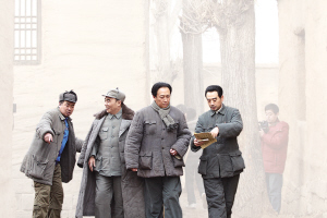 連續(xù)兩天下雪,懷柔影視基地也一片銀裝素裹。記者進入拍攝現(xiàn)場時,工作人員一再叮囑,一定要跺跺腳再進去,免得在剛剛打掃好的通道上再踩上雪。而這個通道,就是片中毛澤東、周恩來、朱德等眾多人物步入七屆二中全會會場的通道。