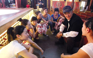 趙本山在二樓一直觀察排練,表情嚴肅。下樓后徑直走到臺前,把8位女孩叫到身邊!岸啻罅耍俊北旧酱笫鍛B(tài)度和藹,先和她們嘮起了家常。