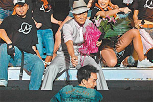 片段一開始就見華仔在臺(tái)邊唱歌,其間一位男歌迷沖破兩道圍欄,趨近臺(tái)前送花。華仔邊唱邊笑著彎下身子,跟對(duì)方握手,并接過他的花。