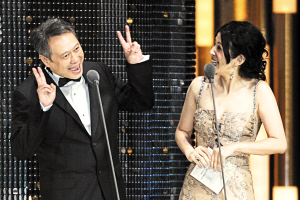 十二月八日晚,第四十四屆金馬獎頒獎典禮在臺北小巨蛋舉行。李安獲得最佳導(dǎo)演獎,右為奪得新人獎的湯唯。 中新社發(fā) 董會峰 攝