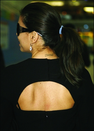 愛的文身,這一招早就不新鮮了。不過(guò),在三級(jí)片、性丑聞這樣的陰影之下,“瘋狂主婦”伊娃還是使出了這一招,文的是她球星老公托尼的球衣號(hào)碼9(NINE)。最近她和辣妹維多利亞走得很近,估計(jì)是偷學(xué)了一招。