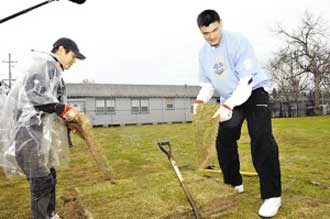 日前,功夫巨星李連杰與中國球員姚明一起出席了美國NBA全明星慈善活動,參加了新奧爾良巨星城的慈善植草皮活動。這個城市在去年遭受到了“卡特琳娜”颶風(fēng)的襲擊,因此這次的全明星球員們不僅僅只是會去比賽,還會幫助當(dāng)?shù)鼐用駛冏鲆恍┐壬频氖虑。其中中國球員姚明和著名的功夫巨星李連杰也在這些慈善事情中做出了自己的貢獻(xiàn)。圖為李連杰與姚明一起合作植草皮。