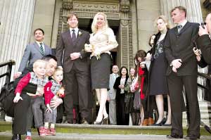 肖恩·賓原訂上個月與女演員蘇克利夫結婚,但在婚禮前24小時臨時取消,蘇克利夫當時說,是個人因素取消婚禮。昨日在倫敦市中心舉行公證結婚前,應邀的十多位至親好友一度擔心他們可能會再變卦,直到新人都出現(xiàn)才松了一口氣。