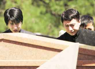 追悼會結束后,成龍手捧父親遺照步出禮堂,祖名則拿著爺爺?shù)呐阍崞肪o隨其后,眾人神情哀傷,隨靈車到達墓地,成龍父子先在墓前跪拜一番以表心意,及后祖名還為爺爺朗讀一段英文詩,說爺爺雖然埋葬在泥土下,自己未能相伴他,亦看不見其影子,但仍希望變成他的土壤,變成雨水去滋潤他。