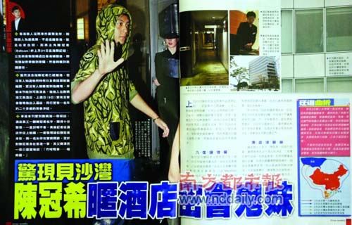 周刊還爆出,一直有吸煙習(xí)慣的陳冠希住在酒店吸煙層9樓,而且他已經(jīng)與酒店達成協(xié)議,一旦有需要,可利用酒店的特殊通道出入。