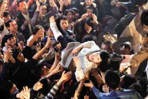 當(dāng)中拍攝一場(chǎng)搖滾音樂(lè)會(huì),為配合劇情需要,周迅穿上白色長(zhǎng)毛衣露面,不過(guò)右腿卻打上石膏,原來(lái)這是導(dǎo)演的安排。但現(xiàn)場(chǎng)有人誤以為周迅真的受了傷,引起一陣恐慌。拍攝時(shí)現(xiàn)場(chǎng)500名臨時(shí)演員更起哄將周迅抬起,像人肉輸送帶般送她上臺(tái),事后周迅大叫過(guò)癮,說(shuō)過(guò)程有如眾星拱月,令自己有女王般的感覺(jué),還笑言有機(jī)會(huì)的話(huà),希望模仿外國(guó)搖滾歌手般“跳水”,跳到臺(tái)下讓觀(guān)眾接住自己。