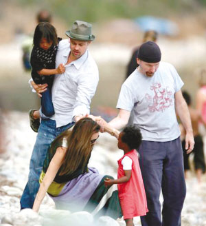 近日,布拉德·皮特、安吉麗娜·朱莉攜養(yǎng)子和養(yǎng)女在法國(guó)南部海邊度假時(shí),被當(dāng)?shù)鼐用窈推渌慰驼J(rèn)出。盡管因有保鏢,沒(méi)人敢輕易上前“騷擾”這家人,但一道道如炬的注目禮仍然讓皮特、朱莉感到很不自在,一家人只好選人少的海灘散步。中途行動(dòng)不便的朱莉一不小心腳底一滑差點(diǎn)載跟頭,幸虧皮特和小女兒眼疾手快將她一把抓住,朱莉才沒(méi)倒地,嚇得她自己也驚呼“好險(xiǎn)”。