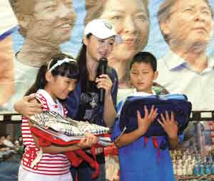 著名影視明星曹穎前天來(lái)到南京參加兒童電影《同一片藍(lán)天》的首映式,這部電影著重反映外來(lái)工子弟學(xué)生精神風(fēng)貌。即日起將向全國(guó)中小學(xué)生公益放映。圖為曹穎在首映式上向從四川受災(zāi)地區(qū)來(lái)寧讀書(shū)的王天幸、馬瑩雪轉(zhuǎn)贈(zèng)學(xué)習(xí)用具。安福 婉愉 攝