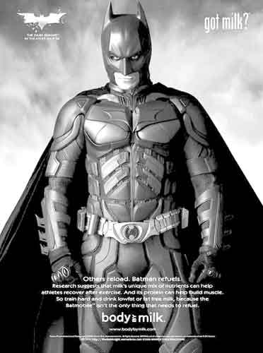 這次廣告的宣傳語是:“大家刻苦訓(xùn)練,然后喝低脂或脫脂牛奶吧。因為不是只有蝙蝠俠車需要加油!痹搹V告將于6月1日正式推出,而最新的蝙蝠俠系列電影則在7月18日上映。
