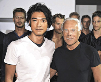 名服裝設(shè)計師阿瑪尼邀金城武(左)到米蘭欣賞新裝發(fā)表會。