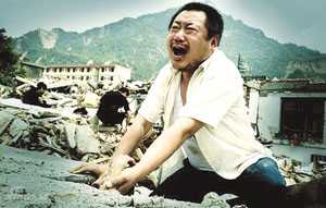 劇照中,范偉拉著“家人”的手哭喊。他表示,自己沖上那片廢墟以后一下就不能自拔了,然后在拼命刨?gòu)U墟,很快手就被磨爛了,但他自己當(dāng)時(shí)根本沒(méi)有感覺(jué)。