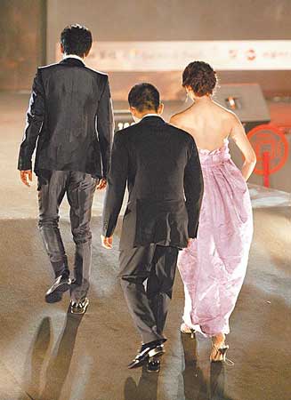中新網(wǎng)7月9日電 電影《赤壁》昨晚在臺(tái)北新店碧潭斥資千萬(wàn)元(新臺(tái)幣 下同)舉行戶外首映禮,吸引約3千名民眾圍觀,3名演員金城武、林志玲、張震帶著作品回到臺(tái)灣心情很high,一向惜字如金的金城武致詞時(shí)特別以“鄉(xiāng)親父老”打動(dòng)觀眾,林志玲身著夏姿訂制粉紅色禮服優(yōu)雅動(dòng)人,但因?yàn)樗闲枪獯蟮绖傁逻^(guò)雨路滑,她只穿上1吋半的高跟鞋,當(dāng)她走上坡度約45度的紅地毯時(shí),還出現(xiàn)使不上力的狀況,只好用手拖住身后的梁朝偉才順利爬上斜坡。