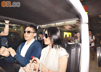 兩人坐機(jī)場(chǎng)小車離開,被傳媒圍堵采訪。香港《太陽(yáng)報(bào)》圖。