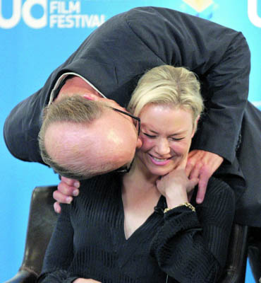 芮妮·齊薇格(右)前日出席多倫多影展記者會時,意外被該片監(jiān)制兼演員的艾哈里斯突襲偷吻,令伊人笑得十分尷尬。