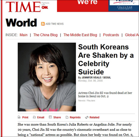 據(jù)《體育朝鮮》報道,美國《時代》雜志網(wǎng)絡(luò)版周二(韓國時間7日)通過題為《明星的自殺震驚全體韓國人》(South Koreans Are Shaken by a Celebrity Suicide)的報道,對把崔真實逼向絕路的韓國社會所存在的問題以及崔真實之死在韓國社會引起的震動進行了集中闡述。