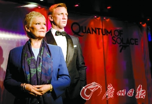 10月15日,倫敦,丹尼爾·克雷格版“邦德”蠟像、老牌女星戴·朱迪·丹奇蠟像進(jìn)駐杜莎夫人蠟像館!鞍畹隆蔽餮b革履瀟灑帥氣,英俊有型電力超強(qiáng),宛如真人在場(chǎng)。