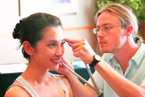 專(zhuān)家在李冰冰臉上貼上標(biāo)簽,以方便為蠟像定型。