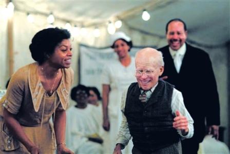 《本杰明·巴頓奇事》是一部劇情怪誕的影片。影片的男主人公是個(gè)叫本杰明·巴頓的怪人(布拉德·皮特飾),他一生下來(lái)就是個(gè)滿頭華發(fā)、一臉褶子的古稀老頭(劇照中皮特的體型很小,估計(jì)是個(gè)“老嬰兒”)。可奇怪的是,他的生物鐘是倒著走的——?jiǎng)e人越活越老,他卻越活越小。巴頓1919年出生,不經(jīng)意間愛(ài)上了一個(gè)名叫黛西的6歲女孩,30年后,兩人終于“長(zhǎng)”得年齡相仿了。他們彼此相愛(ài),度過(guò)了人生中最美好的一段時(shí)光。皮特在化裝和特效的幫忙下,變成了一個(gè)貌似被風(fēng)干的小老頭,形象十分驚人,與壯碩的皮特判若兩人。 欣聞