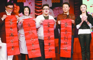 黃百鳴、吳君如、導演谷德昭、郭濤以及姚晨(從左至右)攜《家有喜事2009》為觀眾拜年。