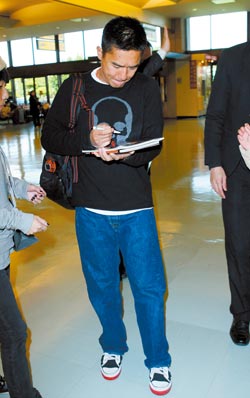 中新網(wǎng)1月16日電 據(jù)臺(tái)灣《中國(guó)時(shí)報(bào)》報(bào)道,梁朝偉結(jié)束《赤壁:決戰(zhàn)天下》臺(tái)灣宣傳行程,15日與金城武分別搭機(jī)離臺(tái)。梁朝偉在機(jī)場(chǎng)親切為影迷簽名。