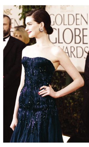 雖然沒有領(lǐng)到“金球”,但是安妮·海瑟薇在紅地毯上分外搶眼,鑲有藍(lán)色寶石的孔雀型耳環(huán)與寶石藍(lán)金絲裹胸禮服相得益彰!