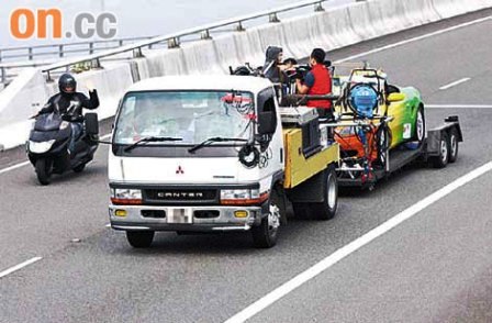 昨日清晨七時,成龍與祖名穿超時空戰(zhàn)士的“父子裝”抵達青馬大橋,駕駛熒光黃色和綠色的左跑車,車尾則放了一大箱冰凍道具樽裝茶,非常搶眼。坐在司機位的成龍在公路上風馳電掣,狀甚威風,其實他們的跑車被固定在貨車托尾板上,相反攝影師要站在托尾板上拍攝,當有大風或大貨車經(jīng)過扯風時,令攝影師搖搖欲墜,驚險萬分。