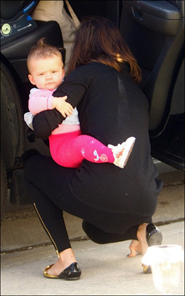 成為了媽媽的杰西卡·阿爾芭已經(jīng)恢復(fù)了窈窕的身材,一身黑色,但是明黃色的書包成為了全身的亮點,星范十足。而懷抱中的閨女則是好像深思者這樣,在想問題。