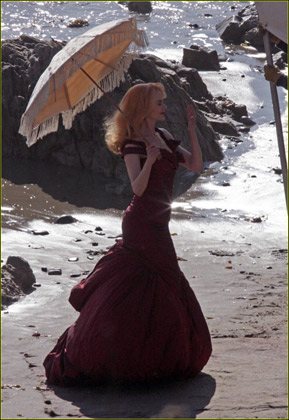 妮可·基德曼2月19日在洛杉磯的某海灘上為某雜志拍攝宣傳寫真,當(dāng)天的妮可·基德曼化身中世紀(jì)的貴婦,穿著暗紅色的絕美長裙,襯得身材玲瓏,肌膚透白,手中的陽傘更是增添了高貴優(yōu)雅,和妮可·基德曼得天獨(dú)厚的氣質(zhì)完全符合。