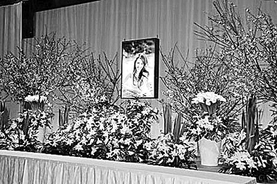 飯島愛的遺體告別式現(xiàn)場布置得非常肅穆,中央場地懸掛了飯島愛遺照,是由日本知名攝影師筱山紀(jì)信拍攝的,曾刊登在《婦人公論》上。同時祭壇上還擺滿了飯島愛生前最喜歡的卡薩布蘭卡,這種花的花語是永不磨滅的愛情,象征了家人友人,以及粉絲們對飯島愛永不磨滅的愛。周圍用樹枝和純白鮮花做裝飾,場地整體顯得肅穆莊重。