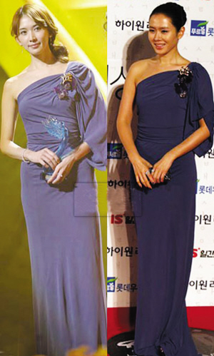 上周五(2月27日)韓國(guó)百想頒獎(jiǎng)典禮,孫藝珍穿長(zhǎng)款紫色禮服出場(chǎng);而在隔天(28日)的2009上海新娛樂(lè)慈善群星會(huì)上,林志玲竟穿一模一樣的禮服登場(chǎng)。撞衫常見(jiàn),而撞得時(shí)間如此緊密,實(shí)在有趣。