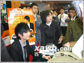 昨天下午,2007“快樂(lè)男聲”冠軍陳楚生和樂(lè)壇新星小類(lèi)同時(shí)現(xiàn)身西安,在新華文軒西安書(shū)城參加“團(tuán)聚音樂(lè)夢(mèng)想”簽唱活動(dòng)。獲悉消息的“花生們”提前幾個(gè)小時(shí)趕到書(shū)城,準(zhǔn)備一睹偶像風(fēng)采。然而,由于到場(chǎng)的歌迷太多,舉辦活動(dòng)的地方能容納的人有限,加上主辦方?jīng)]有協(xié)調(diào)好,致使場(chǎng)面幾度混亂。