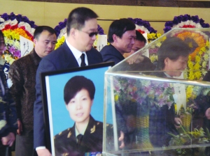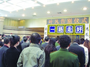 昨天的追悼會現(xiàn)場不但來了很多葉凡生前的好友,也來了不少葉凡生前的戰(zhàn)友,據(jù)武警文工團(tuán)政委尚力峰介紹,“當(dāng)聽說葉凡去世的消息后,所有和她合作過的戰(zhàn)友都驚呆了,我們都不知道她的病情居然那么嚴(yán)重,她沒告訴我們,是不想讓我們操心。∫?yàn)槲渚墓F(tuán)即將要有幾個大型的演出,所以戰(zhàn)友們不能全來,但他們送上了花圈表示哀悼。葉凡在我們團(tuán)是出類拔萃的臺柱子,大型晚會不能少了她,她平時(shí)對自己要求十分嚴(yán)格,對于創(chuàng)作也是一絲不茍。有一次某地發(fā)生洪澇災(zāi)害,葉凡主動請求到一線演出慰問,并創(chuàng)作《真情永遠(yuǎn)》。2003年非典時(shí)期,葉凡已經(jīng)得病,但她沒有說任何理由,再次主動要求參加創(chuàng)作,并寫出《天使的故事》,讓全團(tuán)都為之感動。她也多次獲得過文化部一等獎,可以說現(xiàn)在正是葉凡最輝煌的時(shí)期,可她卻離我們而去,太可惜了!”