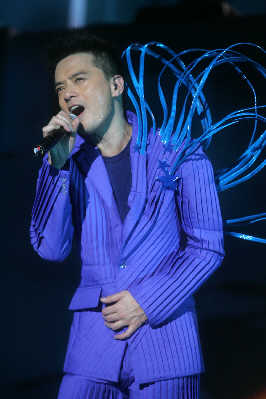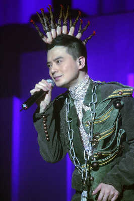 與其他流行歌手的演唱會相比,昨夜的上海大舞臺并未爆滿,但好在滿場都是黃耀明以及“人山人海”的死忠粉絲,所以當(dāng)周耀輝、當(dāng)李端嫻、當(dāng)AT17的ELLEN以及林一峰等人陸續(xù)入場,均收獲了粉絲的熱情尖叫。整個現(xiàn)場猶如“人山人!迸c家人的節(jié)日聚會一般熱鬧,還未開場,內(nèi)場前區(qū)已經(jīng)擠滿了隨著音樂跳躍的歌迷。當(dāng)燈光全部暗下,伴隨著歌迷熱情的歡呼聲,黃耀明猛然出現(xiàn)在舞臺正中,幕布尚未全部拉開,身著白色羽毛褲的黃耀明唱起歌曲《下世紀(jì)再嬉戲》。戴著黃耀明經(jīng)典的妖精耳朵或者頭頂白色長發(fā)的歌迷們開始集體大聲跟唱;蛟S對于不少死忠歌迷而言,這場演出仍然伴隨著許多遺憾,比如黃耀明的造型在早前許多演唱會上用過,開場的帽子曾在“滿天神佛”演唱會上用過,羽毛褲則曾在“光天化日”演唱會上穿過,而后換上的第二套衣服也曾在“達(dá)明一派為人民服務(wù)”演唱會上用過。但每當(dāng)他下臺換裝,場內(nèi)便會響起一陣陣期盼的歡呼聲,甚至有歌迷干脆對著停下來與歌迷打招呼的黃耀明大喊:“講廣東話!”對歌迷而言,能夠一次看到“滿天神佛”、“光天化日”以及黃耀明與港樂合作的三場演唱會的精華,也算是不虛此行。