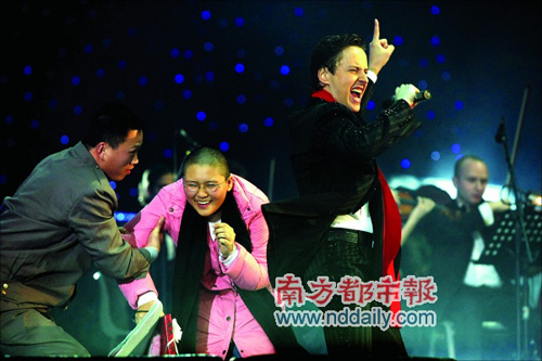 上周六晚,俄羅斯神奇的男高音Vitas第二次來(lái)到廣州開唱。當(dāng)晚,高到男女莫辨的聲音響徹廣州新體育館,寒冷的空氣中人群沸騰!缎切恰、《歌劇2》、《第五元素》等挑戰(zhàn)人類聲音極限的歌曲得到了觀眾最熱烈的歡呼。Vitas第二次來(lái)廣州也放開膽量走進(jìn)了瘋狂的觀眾席,成功引起場(chǎng)內(nèi)人流洶涌,滿場(chǎng)騷動(dòng)。也正因?yàn)楦杳詡兲?dòng),讓此番Vitas廣州、深圳兩場(chǎng)演唱會(huì)充滿驚險(xiǎn)。被歌迷摸臉、強(qiáng)吻、拉倒的場(chǎng)景屢次出現(xiàn),甚至還有獻(xiàn)花女粉絲當(dāng)場(chǎng)暈倒在舞臺(tái)上,讓一直保持迷人微笑的Vitas都手足無(wú)措。