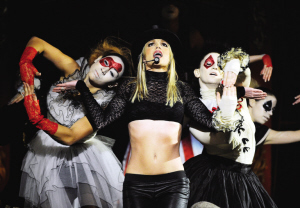 由于當(dāng)天適逢布蘭妮27歲的生日,節(jié)目組為“壽星”推上了一個(gè)巨型大蛋糕,上面附有“生日快樂”和“馬戲團(tuán)”的字樣,預(yù)祝布蘭妮新碟大賣。