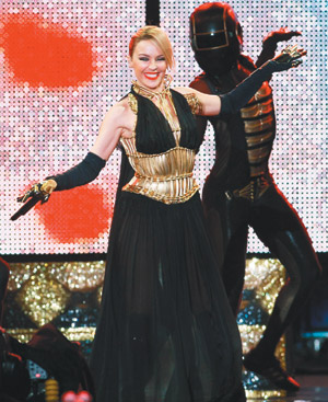 中新網(wǎng)12月5日電 澳洲天后凱莉·米洛(Kylie Minogue)首度赴臺(tái)開(kāi)唱,以“女神”之姿降臨中山足球場(chǎng)舞臺(tái),性感歌舞,征服了現(xiàn)場(chǎng)1萬(wàn)6,000名觀眾。臺(tái)灣“聯(lián)合報(bào)”報(bào)道,當(dāng)晚,凱莉一身金色束腰黑性感洋裝現(xiàn)身,釋放全場(chǎng)熱情,巨星魅力非凡。