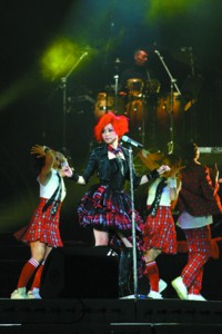 張靚穎與生俱來的不僅是她那副“靚嗓”,還有后天難以培養(yǎng)的藝人氣質(zhì)。能歌的張靚穎昨晚還表現(xiàn)出了善舞的一面,動作的協(xié)調(diào),節(jié)奏的把握,與舞群的配合默契而又出挑,當(dāng)她帶領(lǐng)著舞群踩著節(jié)拍分別走向舞臺兩側(cè)向觀眾致意,頗有大牌風(fēng)范。而當(dāng)她戴著一頂紅發(fā),穿著紅色格子短裙亮相時(shí),立刻讓人聯(lián)想到了之前剛在同一場地開唱的日本歌壇天后濱崎步,兩人的造型極其相似,甚至連舞蹈動作都如出一轍。而在演唱新歌《那不是愛吧》時(shí),張靚穎教了場下歌迷一段“手勢舞”,現(xiàn)場氣氛立刻活躍起來,而這也是濱崎步的“專利”產(chǎn)品,早在上世紀(jì)90年代,她就開始在演唱會中使用,其實(shí)就是電影《浪漫櫻花》中“ParaPara舞”的簡化版。昨晚讓“涼粉”大感驚喜的是,張靚穎竟帶了一個(gè)DV上臺,通過高倍變焦就可看清楚臺下歌迷的臉。然而,就在前兩周,凱莉·米洛的北京和上海演唱會上,凱莉就使用了同樣的橋段拉攏歌迷。昨晚最吸引眼球的還屬吊在半空中的張靚穎“穿著”一條十米長裙的驚艷亮相,其實(shí),這一創(chuàng)意也早在2005年的莫文蔚香港和內(nèi)地演唱會上就使用過,并由菲拉格慕的設(shè)計(jì)師親手打造,盡顯大氣華貴。