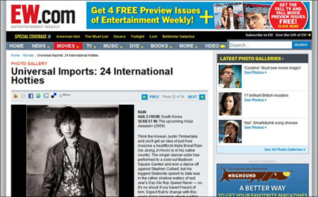 據(jù)體育朝鮮報道,《娛樂周刊》舉出Rain最性感的代表作品為今年即將上映的影片《忍者殺手》。并介紹說,他被譽為韓國的“賈斯汀-汀布萊克”,歌聲、舞蹈、演技樣樣出色,他還在紐約麥迪遜廣場花園劇院舉行演唱會、參加電視綜藝節(jié)目《科爾伯特報告》等,在美國表現(xiàn)得也十分活躍。